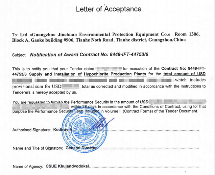 近日,我司收到塔吉克斯坦杜尚別水廠的中標通知書,確定我司為該項目次氯酸鈉發(fā)生器的供應商。
