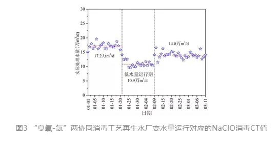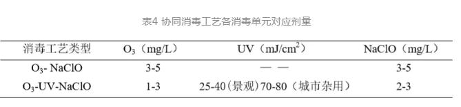 3)“O3-NaClO”協(xié)同消毒工藝,臭氧劑量維持3-5 mg/L,NaClO劑量根據(jù)水量與接觸池(清水池)容積維持CT值不低于8 mg·min/L可以較穩(wěn)定的實(shí)現(xiàn)糞大腸菌群<2 CFU/L的消毒效果,同時(shí)節(jié)省NaClO投加量?!癘3-UV-NaClO”協(xié)同消毒工藝,臭氧1-3 mg/L的投加量能夠提升30%紫外透射率,在紫外消毒單元設(shè)計(jì)劑量下(景觀用水30 mJ/cm2,城市雜用水80 mJ/cm2),紫外出水能夠?qū)崿F(xiàn)糞大腸菌群<2 CFU/L;后續(xù)根據(jù)再生水用途及管網(wǎng)輸配要求進(jìn)行適當(dāng)補(bǔ)氯,保障出水余氯達(dá)到相應(yīng)標(biāo)準(zhǔn)。